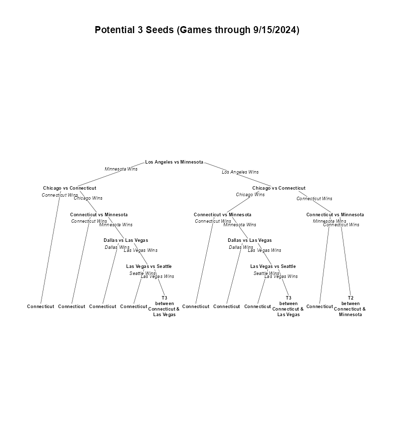 Now that we knew Indiana was headed on the road for the first round, the next logical question is where are the going. By using Seed Projection Tree, we can find all teams that possibly could have been the 3 seed - the team a 6 seed would be facing in a 8 team bracket. As correctly deduced by Pat Boylan, there were 3 possible teams that Indiana could face in the first round: the Minnesota Lynx, the Connecticut Sun, and the Las Vegas Aces.
