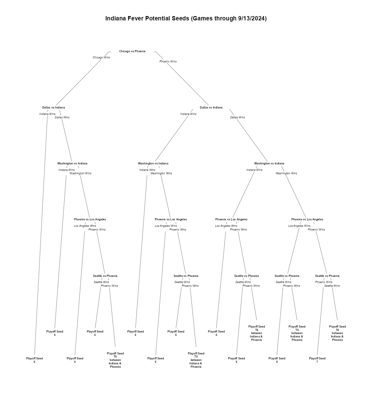 The examples below are all from the 2024 WNBA season. As will be explained later, the further from the end of the season, the more possible scenarios exist. Therefore, to make sure everything fits on a singular graphic, different scenario trees are produced for visualization purposes