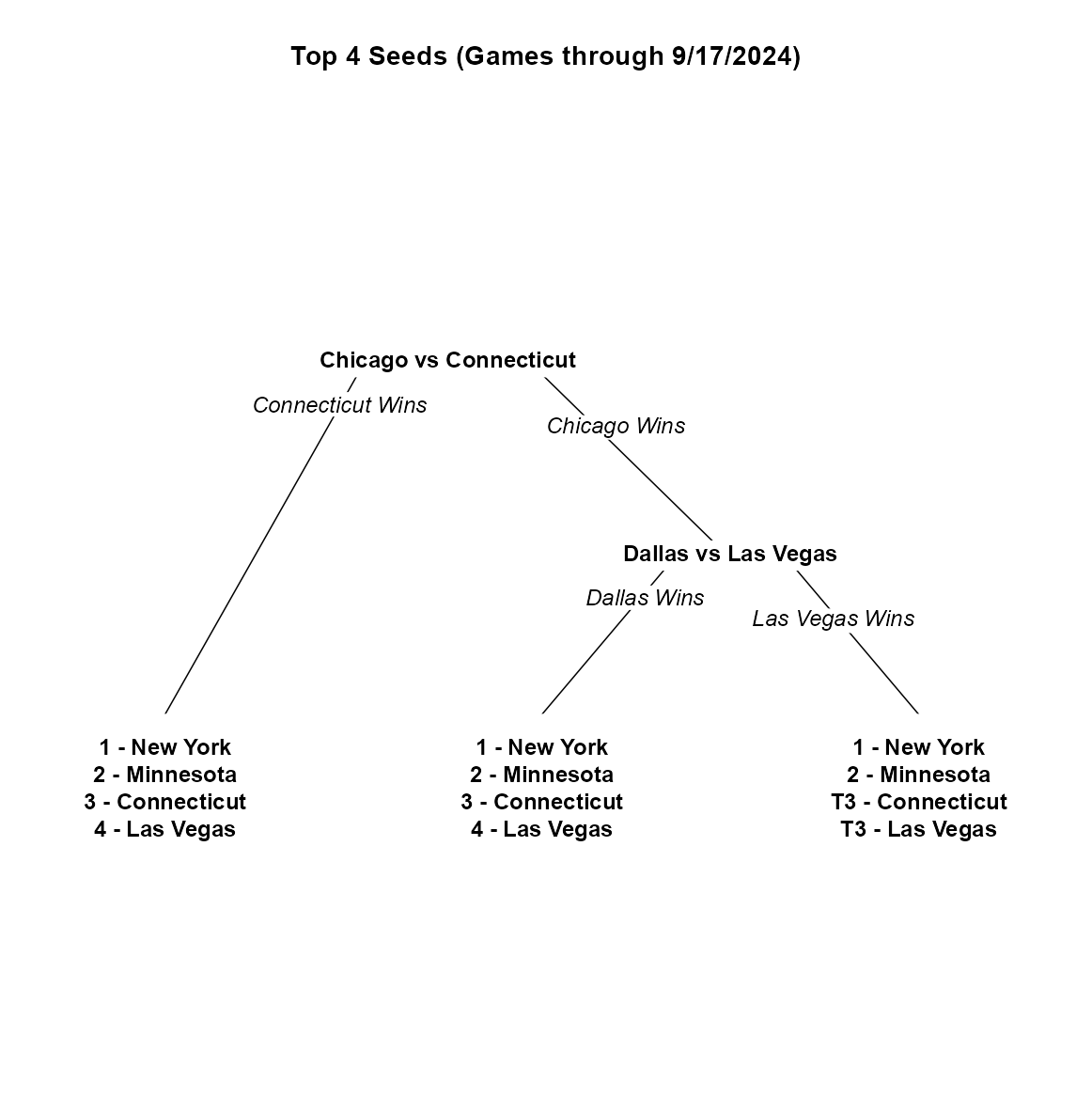 As mentioned previously, in the WNBA the top 4 seeds have home court advantage in the first round of the playoffs. Having a scenario tree that shows the larger picture of who is in the host conversation is valuable for network television when determining what time games should be played. Teams that finished with a better record should be rewarded with a game time that best fits their local timezone. For example, a west coast team such as the Las Vegas Aces should be rewarded for their success and play at a time that fits better than the Seattle Storm who finished with a worse record but is still in the same timezone